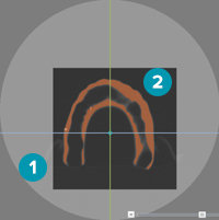 When converting particular parts of the scan images into a 3D model, define which parts of the images the system has to take into account. Set the volume of interest on the viewers to create a surface. On either one of the viewer, re-draw the region using the Set region icon or drag the boundaries. The part that is grayed-out or faded will not be taken into account for conversion. Only the orange part within the darker rectangle is converted into a 3D model.