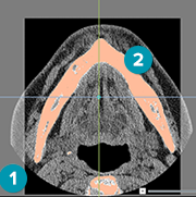 To define which part of the scan images the system has to take into account to convert into a 3D model, set the volume of interest on the viewers. On either one of the viewers re-draw the region by clicking Set region