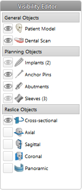 During the treatment planning, different objects will exist in the view scene such as skull parts, implants, measurements, ... The Visibility Editor allows editing the visibility of all these different parts in a straightforward way.