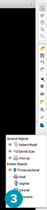 The 3D viewer shows a general overview of the 3D scene which consists of DICOM data merged with the dental scan. in the 2D viewer, the user sees a radiographic cross-section view of this data.