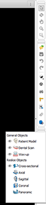 The 3D viewer shows a general overview of the 3D scene which consists of DICOM data merged with the dental scan. in the 2D viewer, the user sees a radiographic cross-section view of this data.